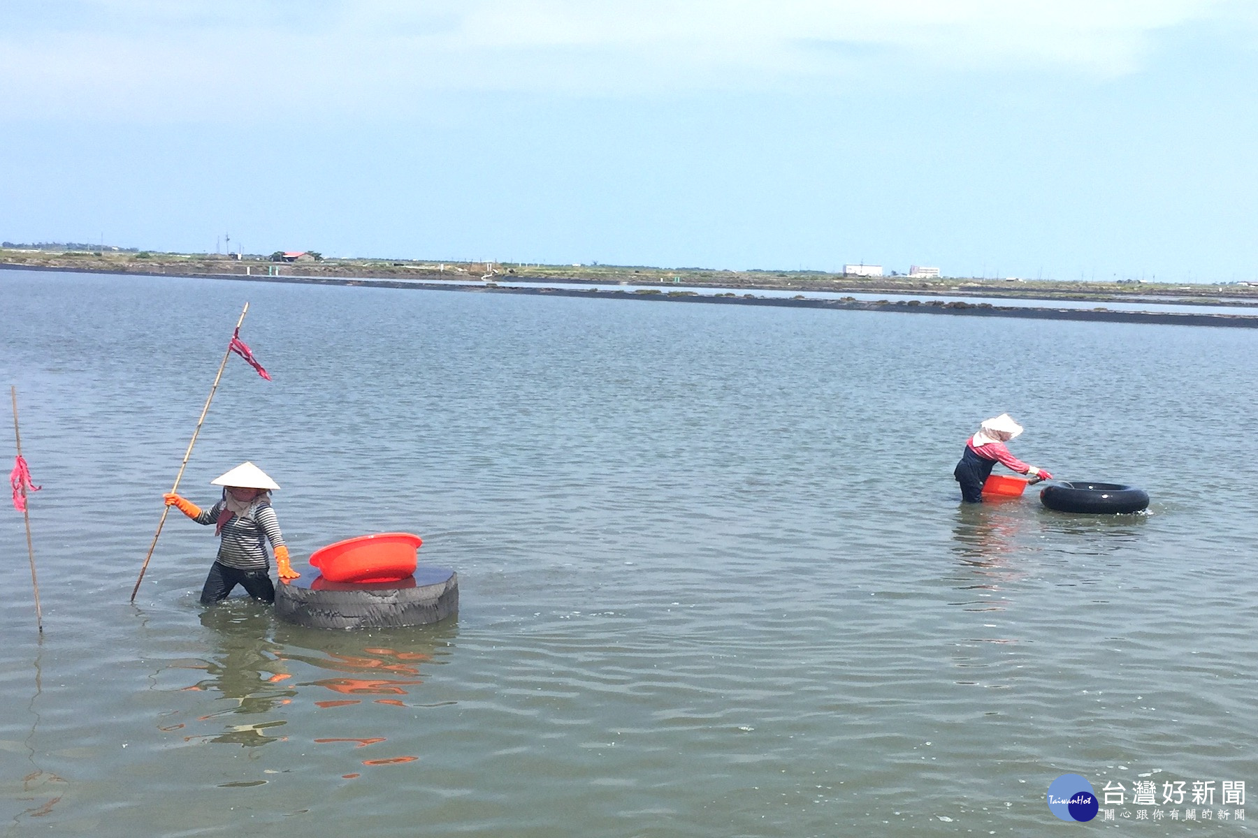 養殖池是汪洋一片,沒有陸地耕種方式用畫線或訂標誌劃分區域是否撒種過,文蛤撒苗一族婦人拿著頭綁有紅布條竹子插在泥濘塭土,邊作記號、邊撒苗,剛還在學習的新住民跟著老師傅後面走,半天下來完成約三公頃大的撒文蛤苗工作。